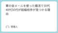 結婚して家庭を持てば、出会い系を自由に使うことはほぼ不可能になります。既婚者が利用すれば秘密保持が難しく、万が一発覚すれば信頼関係が壊れ、離婚のリスクすらあります。つまり、出会い系を安心して使えるのは独身のうちだけなのです。だからこそ「結婚する前に場数を踏む」ことが重要になります。複数の女性とやり取りし、会ってみることで恋愛の流れや自分の価値観が明確になり、結婚相手を選ぶ基準がはっきりします。経験不足のまま相談所に駆け込むより、独身の特権を活かして出会い系で場数を踏んでおくことが、後悔しない婚活につながります。
